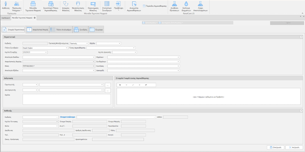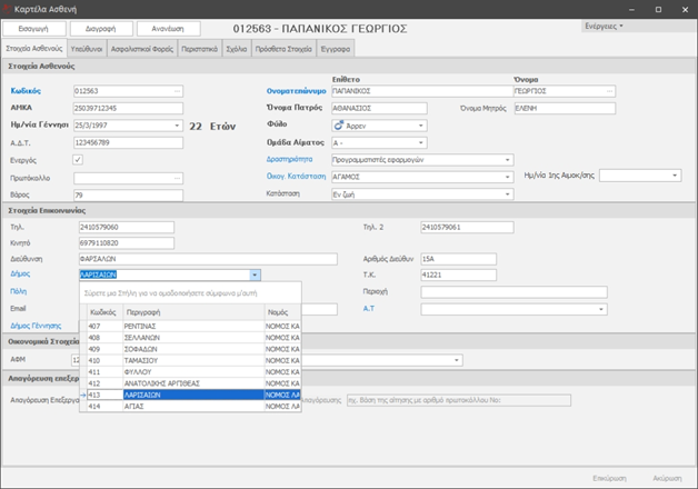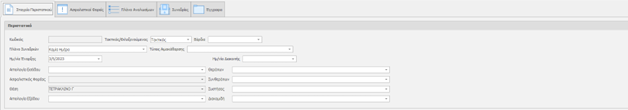 Σημείωση: Τα πεδία με έντονη γραμματοσειρά (bold) είναι απαραίτητα για τη καταχώρηση της εγγραφής. Τα πεδία με μπλε ετικέτα είναι πεδία που η τιμής τους προέρχεται από μία λίστα επιλογών. Για να κάνουμε αναζήτηση σε αυτά μπορούμε να γράψουμε τα πρώτα γράμματα της εγγραφής που ψάχνουμε.