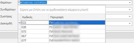 Στη συνέχεια επιλέγουμε τον θεράποντα Ιατρό. Θυμίζουμε ότι το πεδίο Θεράπων ιατρός είναι με μπλε ετικέτα οπότε οι τιμές προέρχονται από πίνακα, πληκτρολογώντας τα πρώτα γράμματα του ιατρού εμφανίζονται στη λίστα οι διαθέσιμοι ιατροί που το όνομα τους εμπεριέχει τα στοιχεία αναζήτησης. Εάν δεν υπάρχει ο ιατρός που αναζητούμε τότε θα πρέπει να τον καταχωρήσουμε στη λίστα με τους θεράποντες ιατρούς.