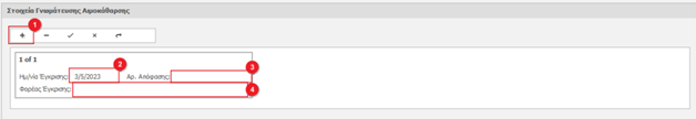 Κάνουμε κλικ στο κουμπί με το σύμβολο “+”(1) για να καταχωρήσουμε νέα Ιατρική Γνωμάτευση. Στη συνέχεια συμπληρώνουμε την ημερομηνία έκδοσης(2), τον αριθμό της Γνωμάτευσης(3) και τον Ιατρό(4) που την συνέταξε.