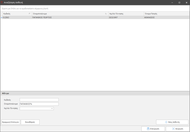 - Θα εμφανιστεί ένας διάλογος επιλογής στοιχείων ασθενή σύμφωνα με τα γράμματα που έχουμε εισάγει.